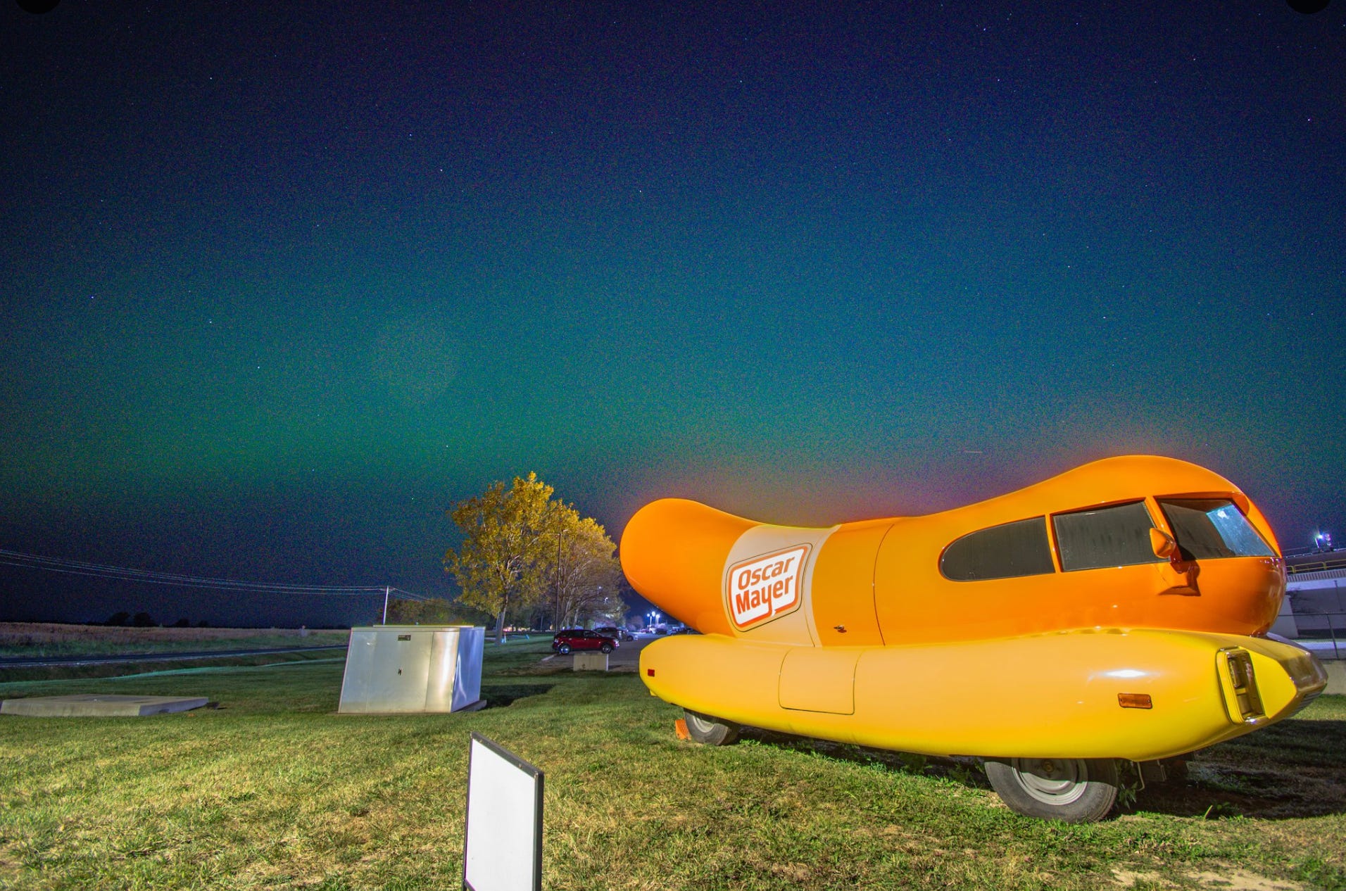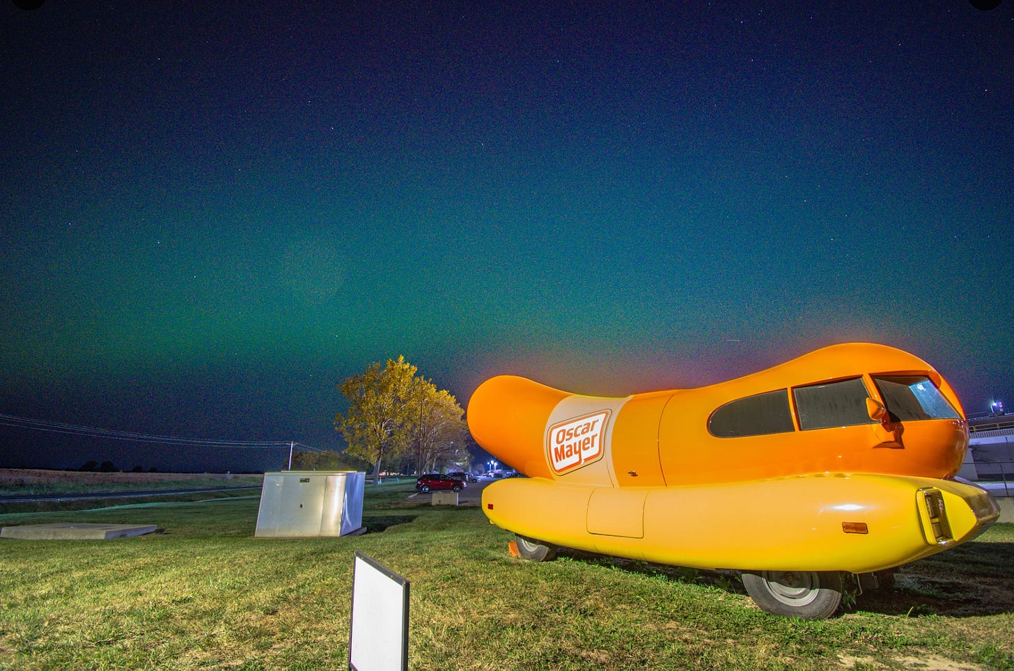 I’m looking at a photo of the aurora borealis with the Oscar Meyer weinermobile parked prominently in the foreground. I’m hoping it was taken just outside Madison, Wisconsin, but it’s from Kirksville, Missouri. I’m in Oakland, CA, so Kirksville, MO can be just outside Madison, if you want to be like that. I skipped the vast majority of a solid TNF game to watch the Yankees close out the Royals, so maybe I want to be like that this week.